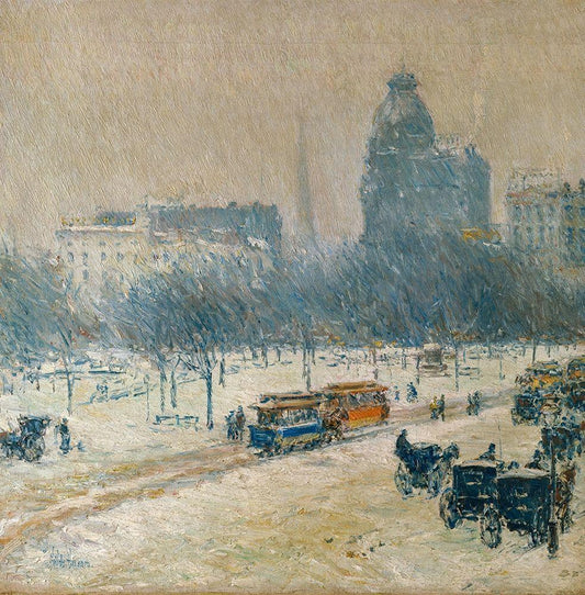 Winter in Union Square White Modern Wood Framed Art Print with Double Matting by Hassam, Childe