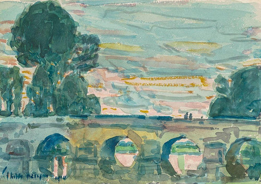 The Bridge at Grez White Modern Wood Framed Art Print with Double Matting by Hassam, Childe