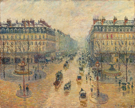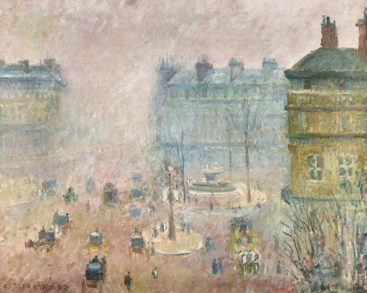 Place du Theatre Francais, Fog Effect White Modern Wood Framed Art Print with Double Matting by Pissarro, Camille