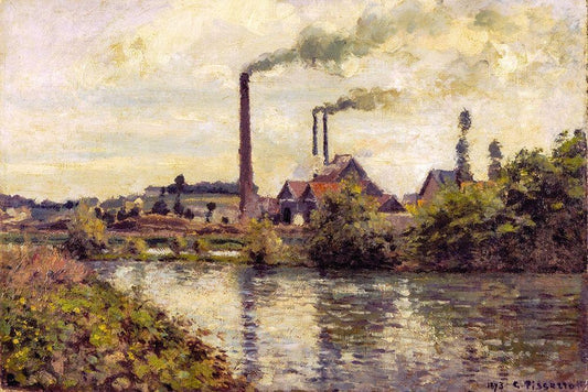 The Factory at Pontoise White Modern Wood Framed Art Print with Double Matting by Pissarro, Camille