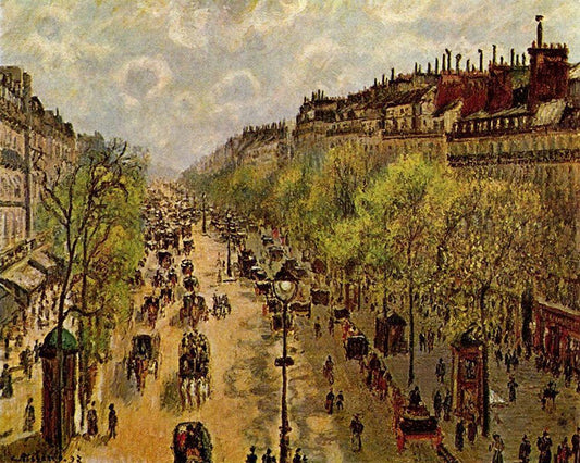 Boulevard Montmartre, Morning, Cloudy Weather White Modern Wood Framed Art Print with Double Matting by Pissarro, Camille