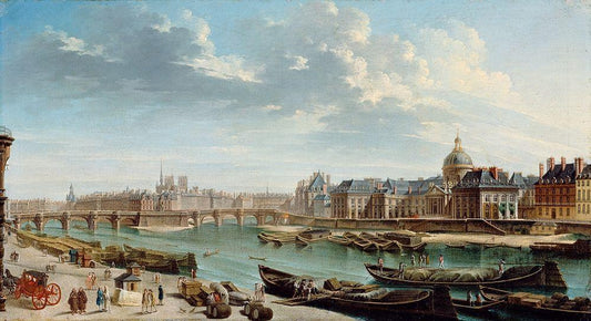 A View of Paris from the Pont Neuf White Modern Wood Framed Art Print with Double Matting by Raguenet, Jean-Baptiste