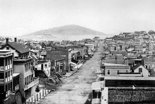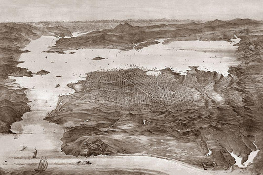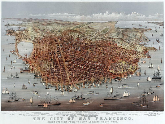 The City of San Francisco; Birds Eye View from the Bay Looking South-West White Modern Wood Framed Art Print with Double Matting by Currier and Ives