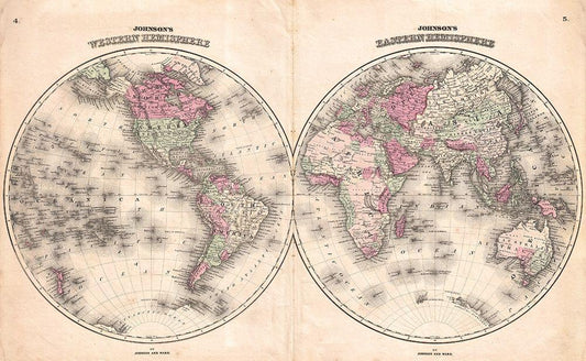 1862 Johnson Map of the World White Modern Wood Framed Art Print with Double Matting by Johnson