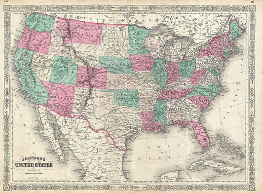 1866 Johnson Map of the United States White Modern Wood Framed Art Print with Double Matting by Johnson