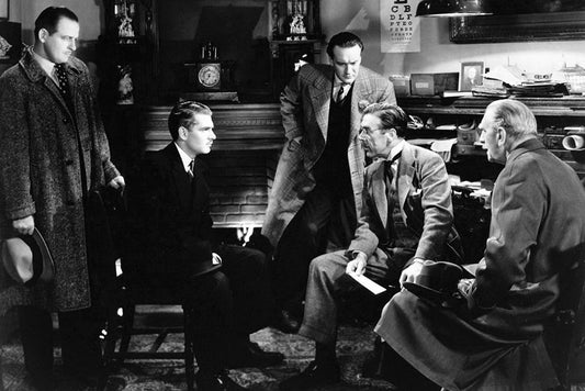 Reginald Denny, Laurency Olivier, George Sanders, Leo G. Carroll, Rebecca, 1940 White Modern Wood Framed Art Print with Double Matting by Vintage Hollywood Archive