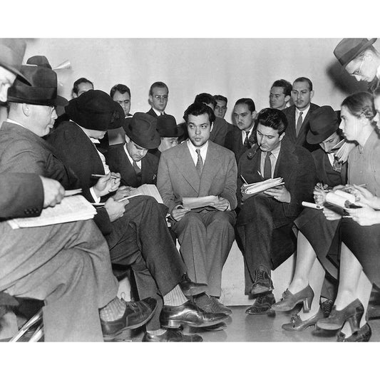 Orson Welles with reporters after the War of the Worlds radio broadcast, 1938 White Modern Wood Framed Art Print by Vintage Hollywood Archive