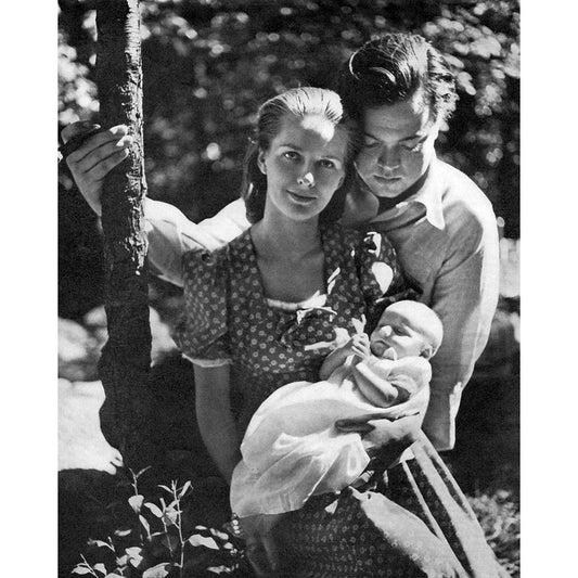 Orson Welles, Virginia Nicolson Welles with their baby daughter White Modern Wood Framed Art Print by Vintage Hollywood Archive