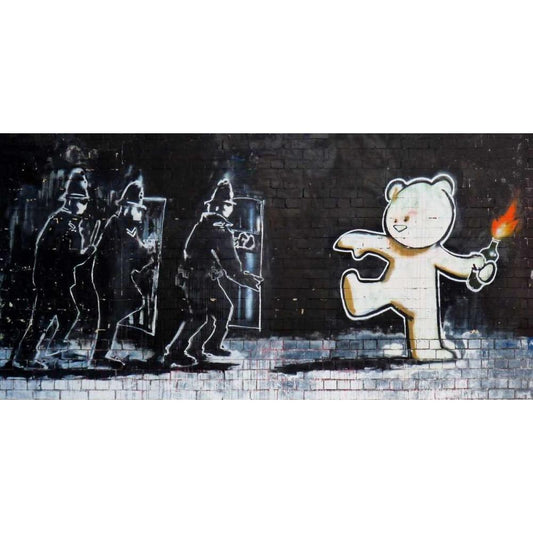 Stokes Croft Road, Bristol (graffiti attributed to Banksy) White Modern Wood Framed Art Print by Anonymous (attributed to Banksy)