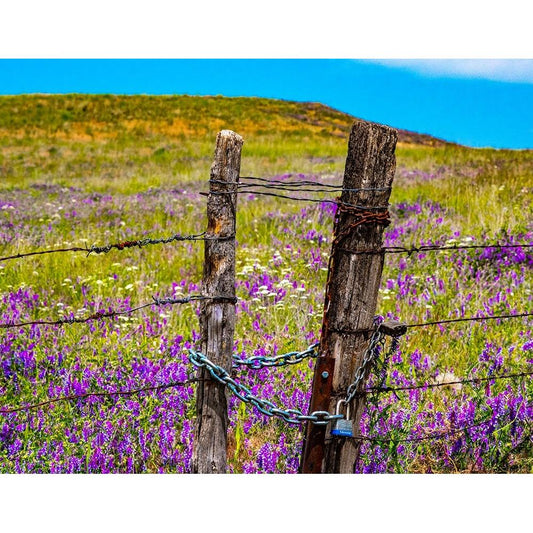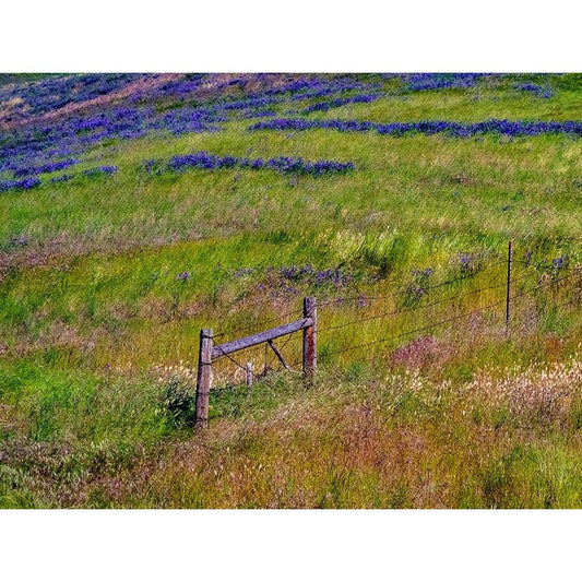 USA-Washington State-Benge and field of vetch blooming with wooden fenced gate and lock Gold Ornate Wood Framed Art Print with Double Matting by Gulin, Sylvia