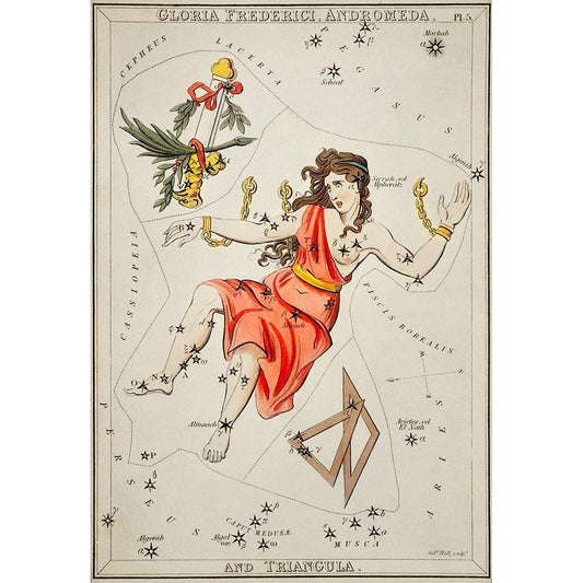 Astronomical chart illustration of Gloria Frederici-Andromeda Gold Ornate Wood Framed Art Print with Double Matting by Hall, Sidney