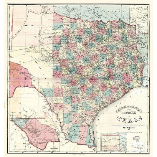 Travellers Map Texas - Pressler 1867 Gold Ornate Wood Framed Art Print with Double Matting by Pressler