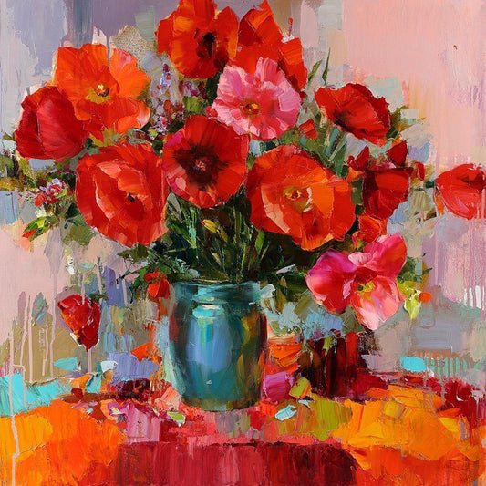 Red Flowers Gold Ornate Wood Framed Art Print with Double Matting by Fasani