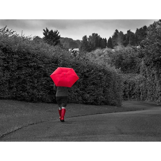 Red Boots and Umbrella Gold Ornate Wood Framed Art Print with Double Matting by Anonymous