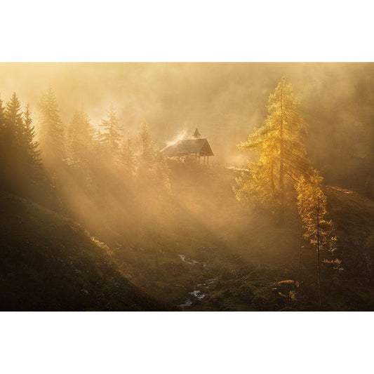 Alpine Church In The Morning Fog Gold Ornate Wood Framed Art Print with Double Matting by Rericha, Daniel