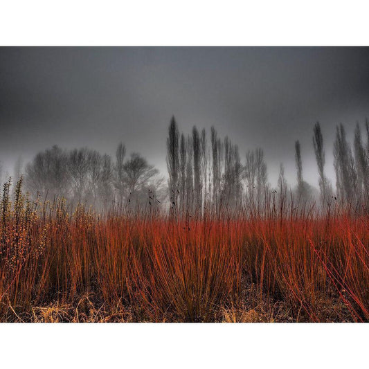 Red Leaves And The Hidden Path. Gold Ornate Wood Framed Art Print with Double Matting by Londal, Leif