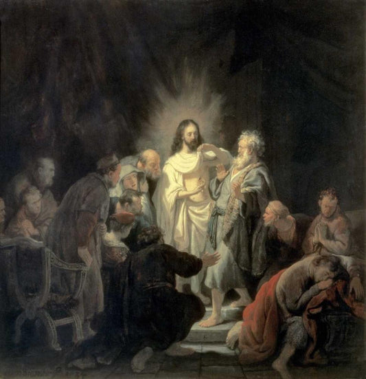 Disbelief of Apostle Thomas White Modern Wood Framed Art Print with Double Matting by Van Rijn, Rembrandt
