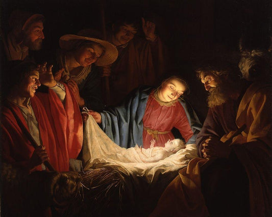 Adoration of the Shepherds White Modern Wood Framed Art Print with Double Matting by van Honthorst, Gerard
