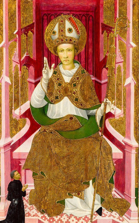 A Bishop Saint with a Donor White Modern Wood Framed Art Print with Double Matting by Spain 15th Century