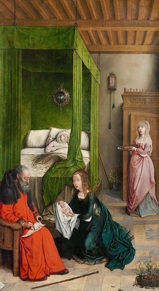 The Birth and Naming of John the Baptist White Modern Wood Framed Art Print with Double Matting by Flandes, Juan de