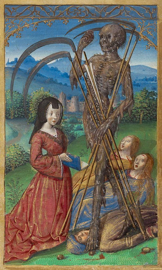 Denise Poncher before a Vision of Death White Modern Wood Framed Art Print with Double Matting by Master of the Chronique Scandaleuse