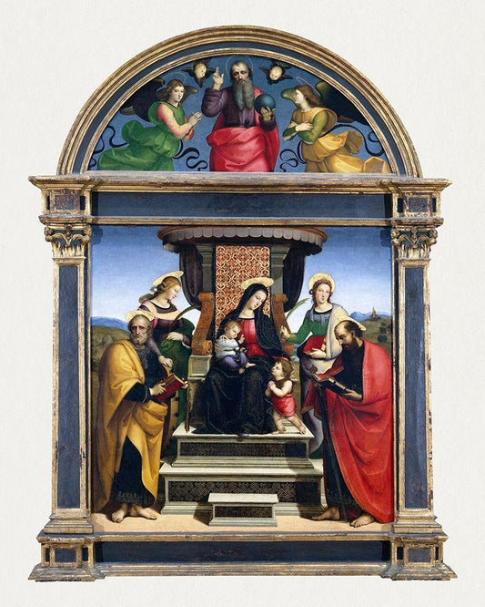 Madonna and Child Enthroned with Saints White Modern Wood Framed Art Print with Double Matting by Raphael