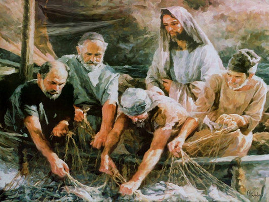 Jesus with Fishers White Modern Wood Framed Art Print with Double Matting by Medeiros, Celito