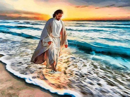 Jesus walking on the Beach White Modern Wood Framed Art Print with Double Matting by Medeiros, Celito