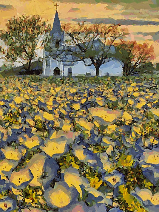 White Church behind a Filed with Flowers White Modern Wood Framed Art Print with Double Matting by Medeiros, Celito