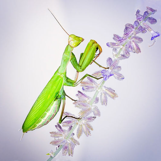 Praying Mantis On Russian Sage White Modern Wood Framed Art Print with Double Matting by Murphy, Benton