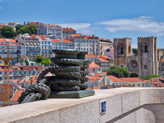 Portugal-Lisbon-View of the Lisbon Cathedral from the Arco da Rua Augusta White Modern Wood Framed Art Print with Double Matting by Eggers, Julie