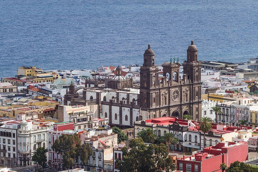 Spain-Canary Islands-Gran Canaria Island-Arucas-high angle view of town White Modern Wood Framed Art Print with Double Matting by Bibikow, Walter