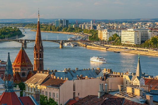 View from Castle Hill of the Margaret Bridge crossing the Danube River-Buda side-Central Budapest-C White Modern Wood Framed Art Print with Double Matting by Haseltine, Tom