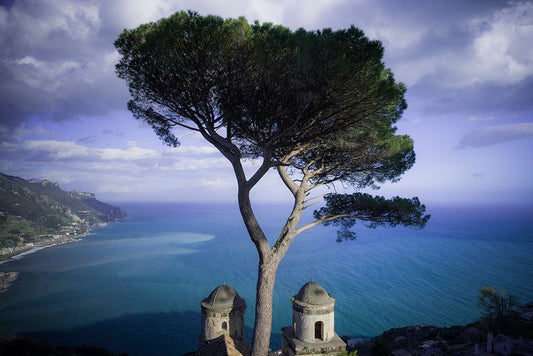 Europe-Italy-Ravello-Cypress tree and church domes overlook ocean White Modern Wood Framed Art Print with Double Matting by Jaynes Gallery
