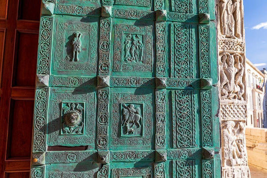 Italy-Apulia-Trani-Trani San Nicola Pellegrino cathedral Intricately carved door White Modern Wood Framed Art Print with Double Matting by Wilson, Emily