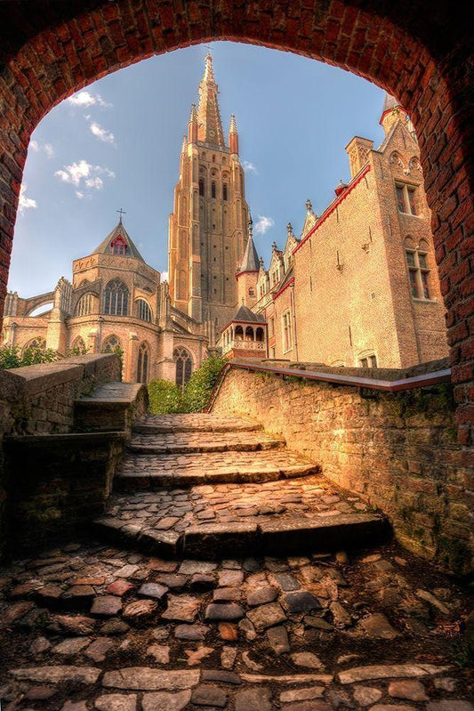 An arch leads to a church in Bruges-Belgium White Modern Wood Framed Art Print with Double Matting by Steve Mohlenkamp