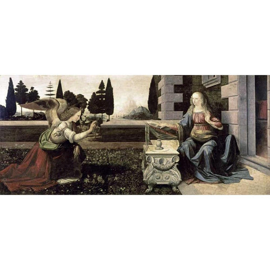Annunciation Black Modern Wood Framed Art Print with Double Matting by Da Vinci, Leonardo