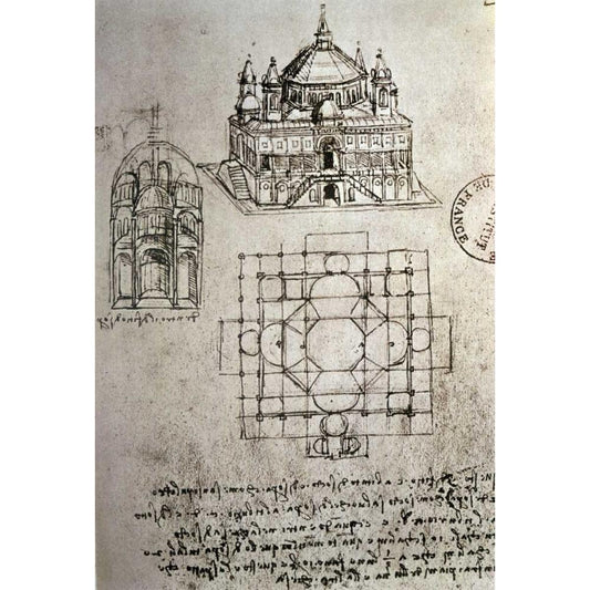Sketch of a Square Church with Central Dome and Minaret Black Modern Wood Framed Art Print with Double Matting by Da Vinci, Leonardo