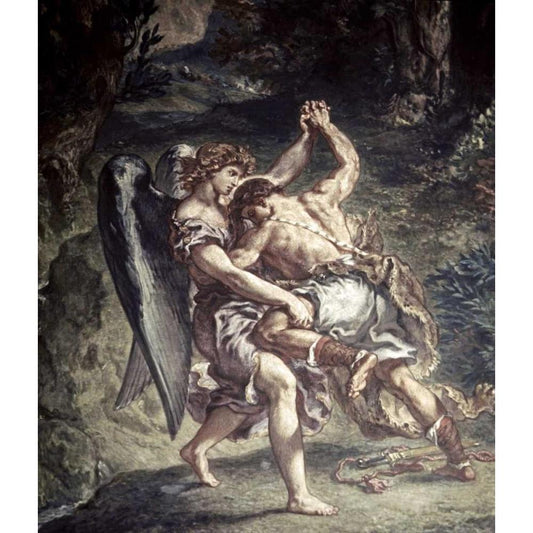 Jacob Wrestles With The Angel Black Modern Wood Framed Art Print with Double Matting by Delacroix, Eugene