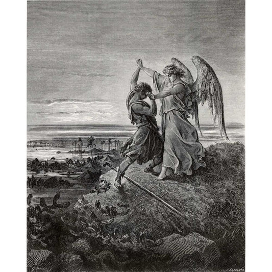 Jacob Wrestling With The Angel Black Modern Wood Framed Art Print with Double Matting by Dore, Gustave