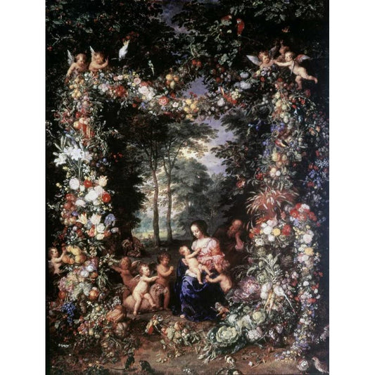 Holy Family W/ Wreath of Fruit and Flowers Black Modern Wood Framed Art Print with Double Matting by Jan Brueghel the Elder