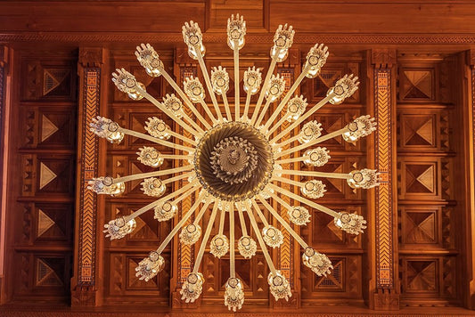 Middle East-Arabian Peninsula-Oman-Muscat-Chandelier in the Sultan Qaboos Grand Mosque in Muscat White Modern Wood Framed Art Print with Double Matting by Wilson, Emily M.