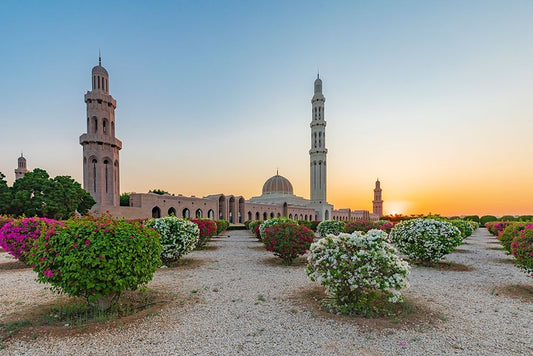 Middle East-Arabian Peninsula-Oman-Ad Dakhiliyah-Nizwa-Sunset at the Sultan Qaboos Grand Mosque White Modern Wood Framed Art Print with Double Matting by Wilson, Emily M.