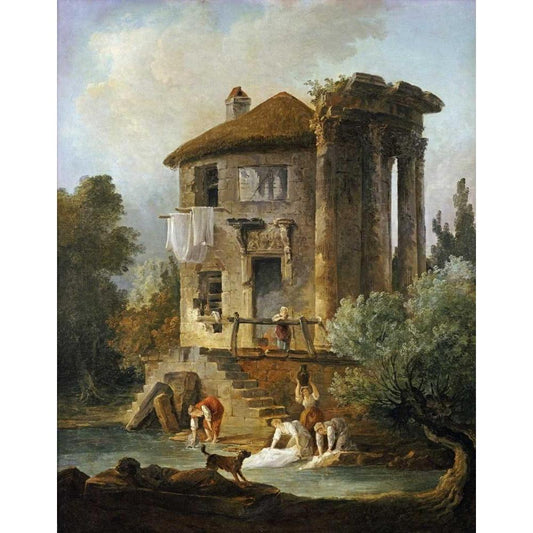 Washerwomen Outside The Temple of The Sibyl, Tivoli Black Modern Wood Framed Art Print with Double Matting by Robert, Hubert