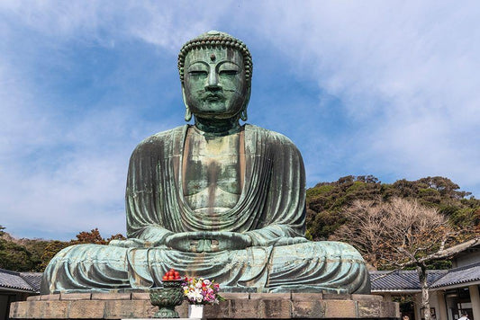 The Great Buddha-Daibutsu-offerings in front-blue sky above in Kamakura-Japan White Modern Wood Framed Art Print with Double Matting by Haddad, Sheila