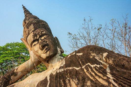 Reclining Buddha statue-Xieng Khuan-Xiengkuane-Buddha Park-Southeast Asia White Modern Wood Framed Art Print with Double Matting by Haseltine, Tom