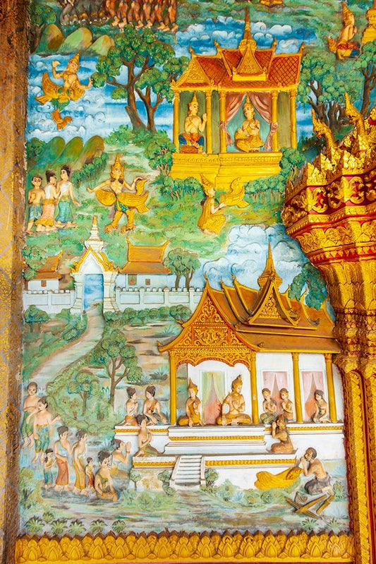 Luang Prabang- Laos. Ancient mural carvings in Wat Mahathat facade. White Modern Wood Framed Art Print with Double Matting by Haseltine, Tom