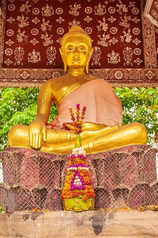 Laos- Luang Prabang. Golden Buddha statue and altar. White Modern Wood Framed Art Print with Double Matting by Haseltine, Tom