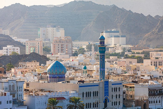 Middle East-Arabian Peninsula-Oman-Muscat-Muttrah-Blue minaret and dome of a mosque in Muttrah White Modern Wood Framed Art Print with Double Matting by Wilson, Emily M.