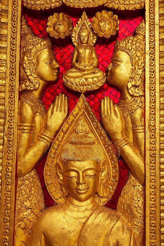 Laos- Luang Prabang. Golden relief carving of Buddha. White Modern Wood Framed Art Print with Double Matting by Haseltine, Tom